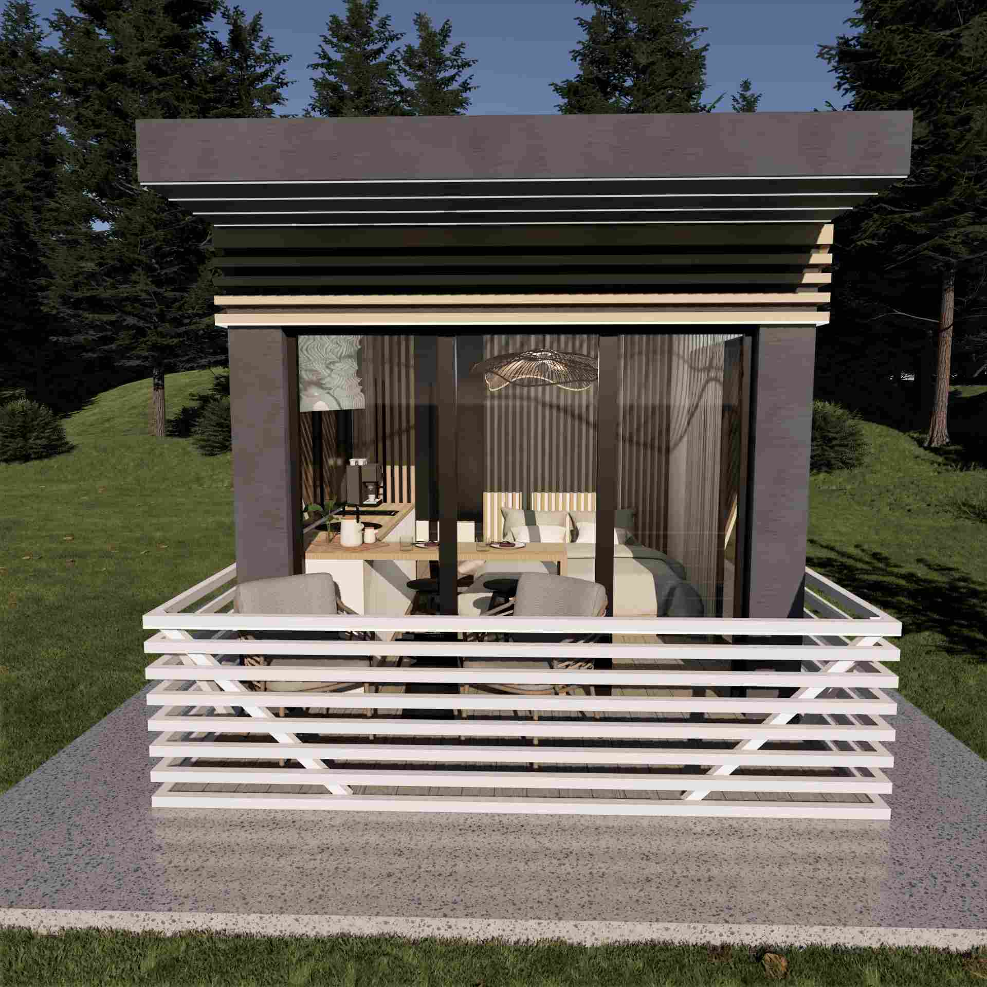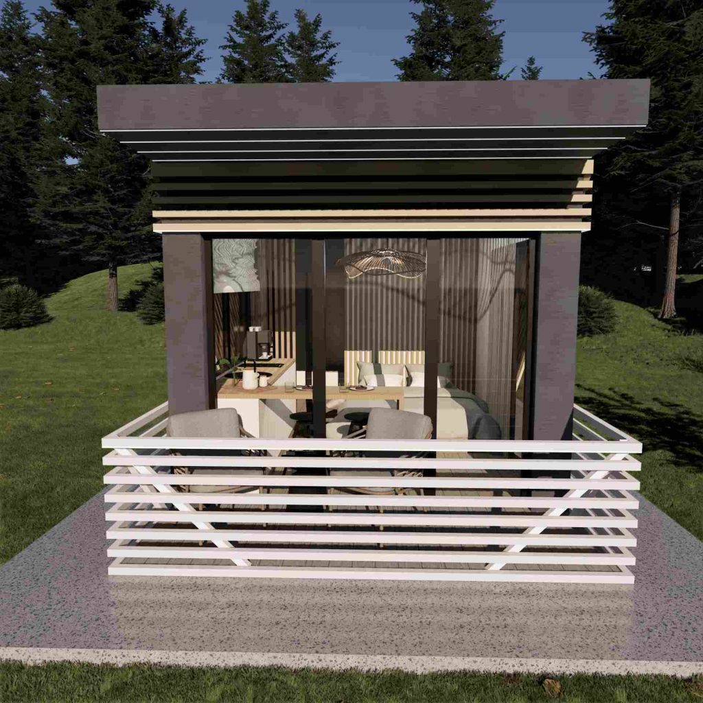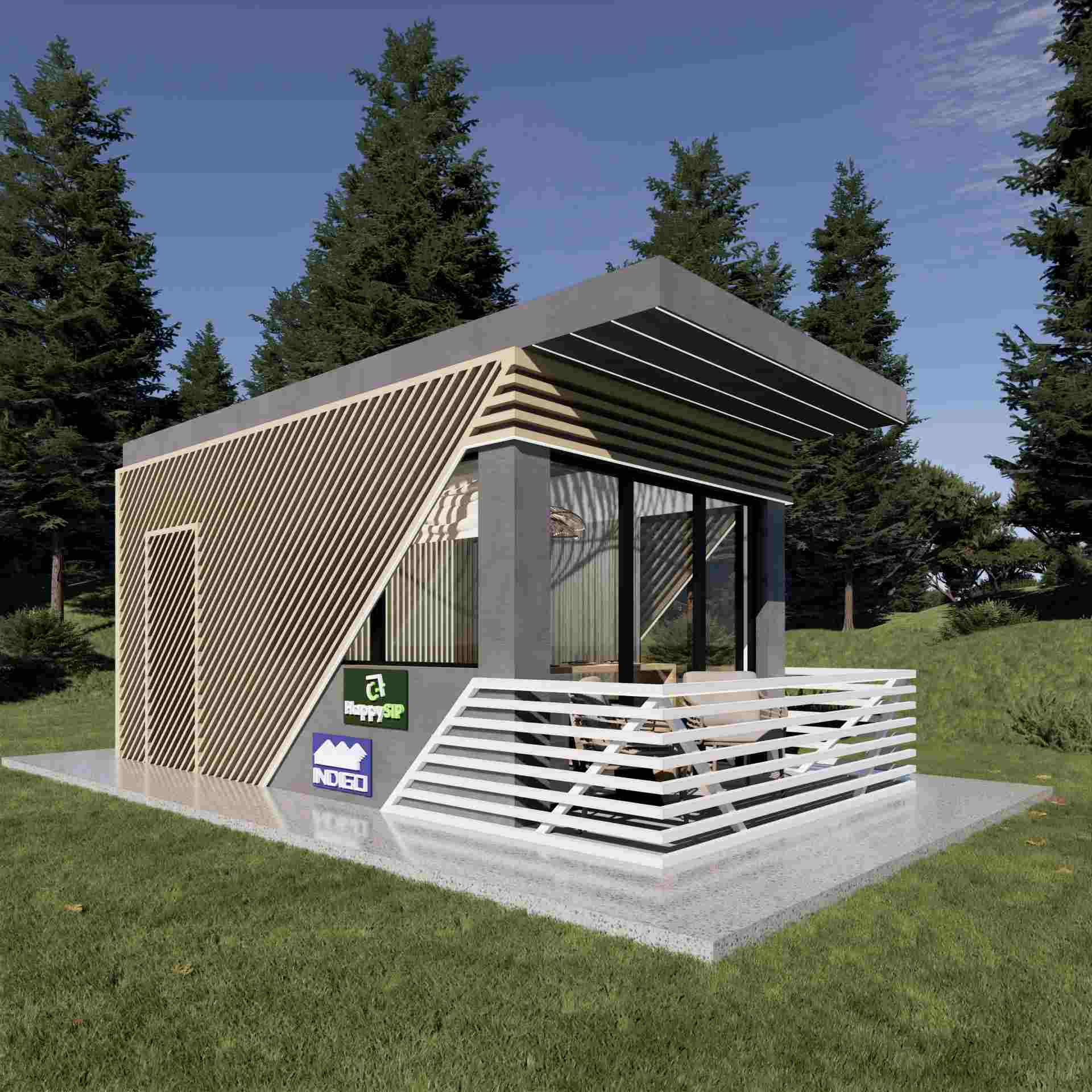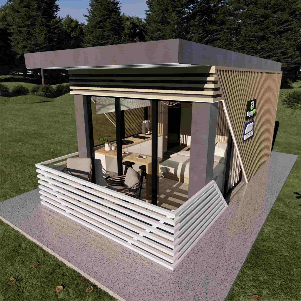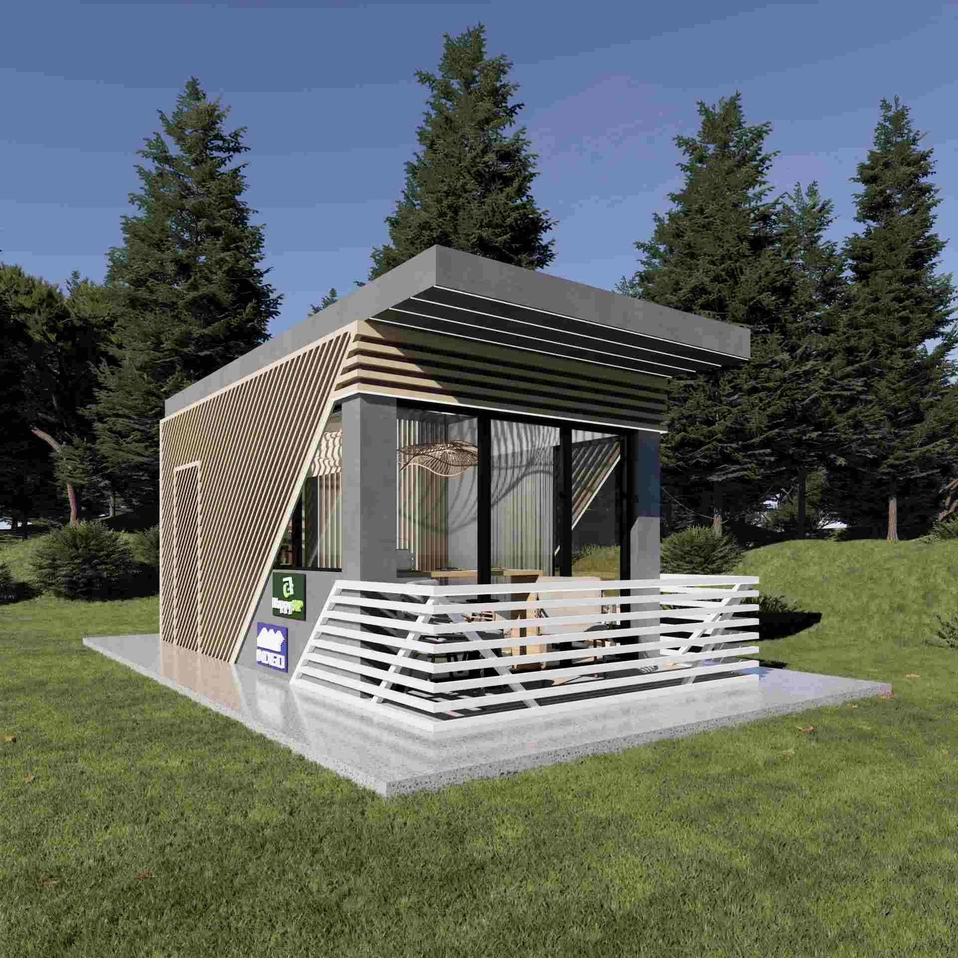 La capsula abitativa su struttura in legno e pannelli SIP, realizzata dal team di Happy Home Corporation, è un modello che propone un nuovo approccio nel settore HORECA, ma anche per le case vacanza. Questo modello è ideale per l'affitto in modalità alberghiera, con dimensioni compatte e una suddivisione ottimale degli spazi.